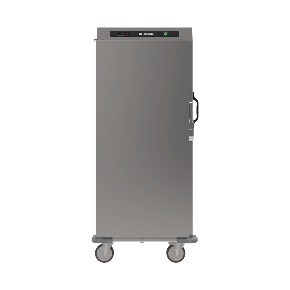 Dulap pentru mentinere la cald si/sau dospire, capacitate 20 GN1/1 sau 10 GN2/1, cu umidificare, termostat control temperatura 0-90°C, afisaj digital temperatura, inox AISI304 cu finisaj satinat, 4 roti pivotante din care 2 cu frana, bumpere din cauciuc, dimensiuni 890x707x1565hmm, alimentare 220V, putere 2100W, greutate 105kg